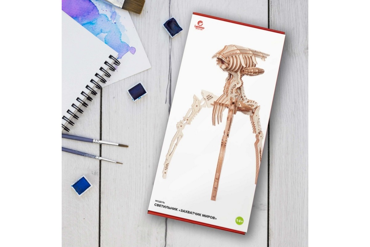Деревянный 3D конструктор Lemmo Модель Светильник "Захватчик миров". Детали конструктора выполнены из качественной древесины. Набор укомплектован наждачной бумагой. В результате сборки получается полноценная красивая игрушка с подвижными элементами. У собранной модели двигается и фиксируется «голова», подвижные опоры конструкции, источник искусственного освещения. При желании светильник можно раскрасить акриловыми красками. После сборки при желании можно раскрасить акриловыми и гуашевыми красками.