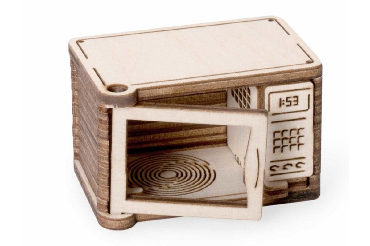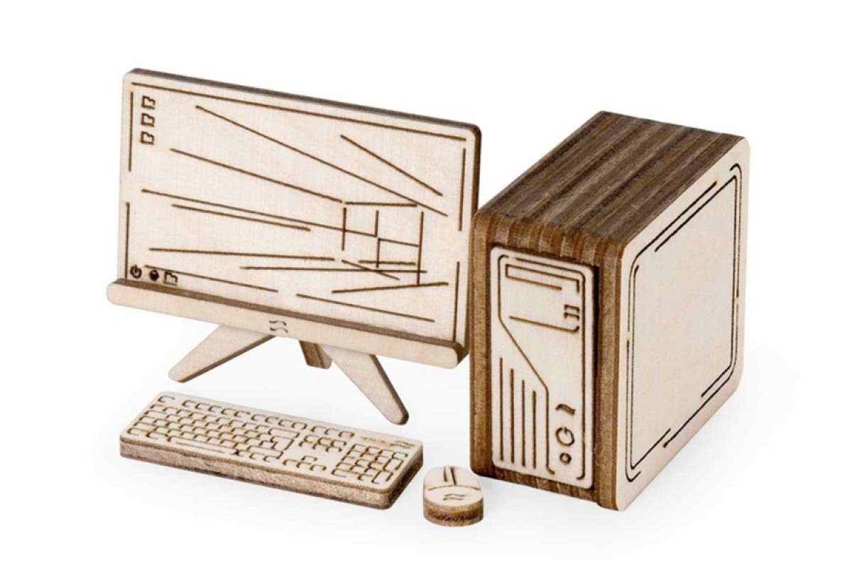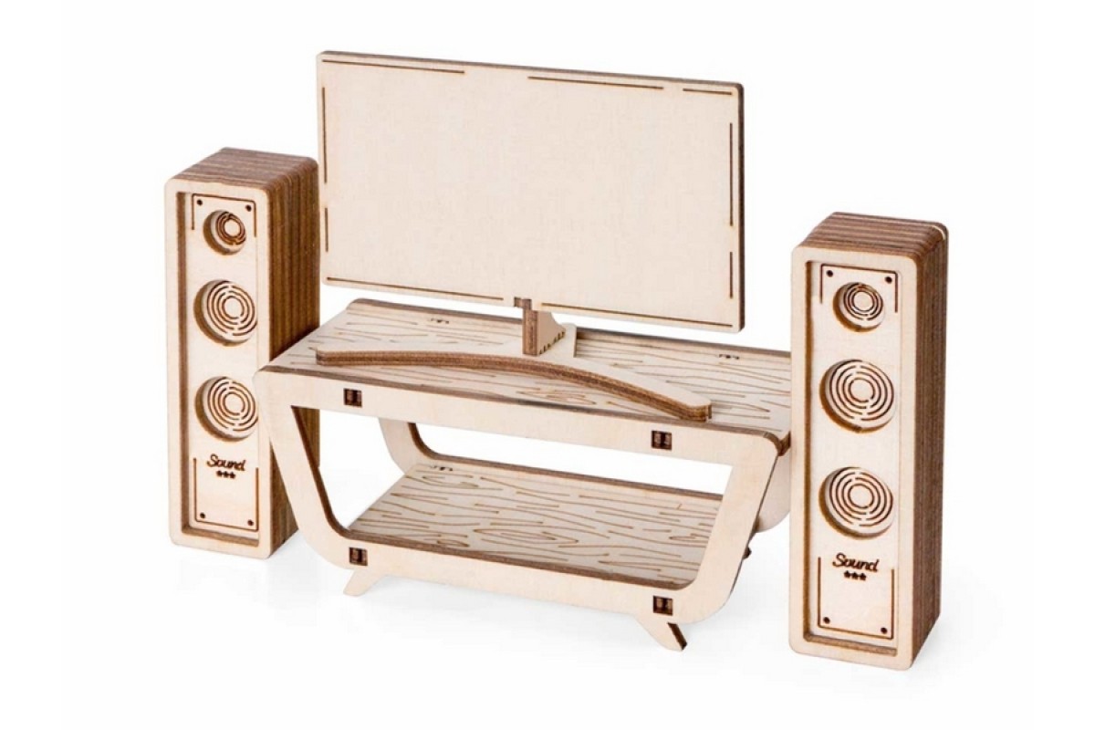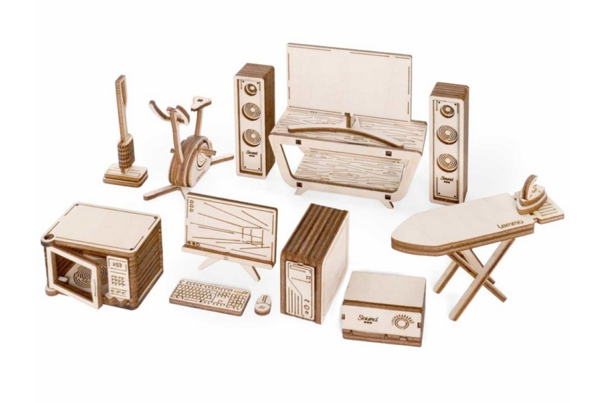Деревянный 3D конструктор Lemmo Набор мебели "Бытовая техника". Детали конструктора выполнены из качественной древесины. Набор укомплектован наждачной бумагой. В результате сборки получается большой набор бытовой техники с подвижными элементами, в который входят колонки, телевизор, столик, пылесос, тренажёр, микроволновка, монитор, клавиатура, мышка, системный блок, музыкальный центр, гладильная доска, утюг. Крутятся педали тренажёра, вращается щётка пылесоса, открывается дверца микроволновки, раскладывается гладильная доска. При желании можно раскрасить акриловыми красками.