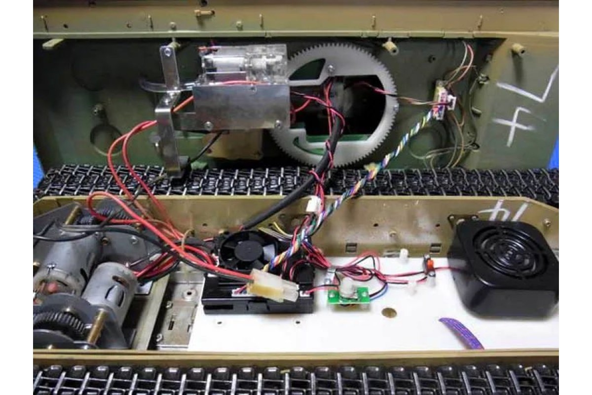 Модель полностью готова к работе, филигранно раскрашена и имеет все необходимые аксессуары для эксплуатации. Инфракрасная пушка, выхлопные трубы оборудованы дым - системой, движение модели сопровождается звуковой имитацией работы двигателя! На модели светятся фары, и вращается башня влево/вправо в секторе 360°, ствол откланяется вверх/вниз. Работающая подвеска катков, лязг гусениц заставляют поверить в реальность происходящего!