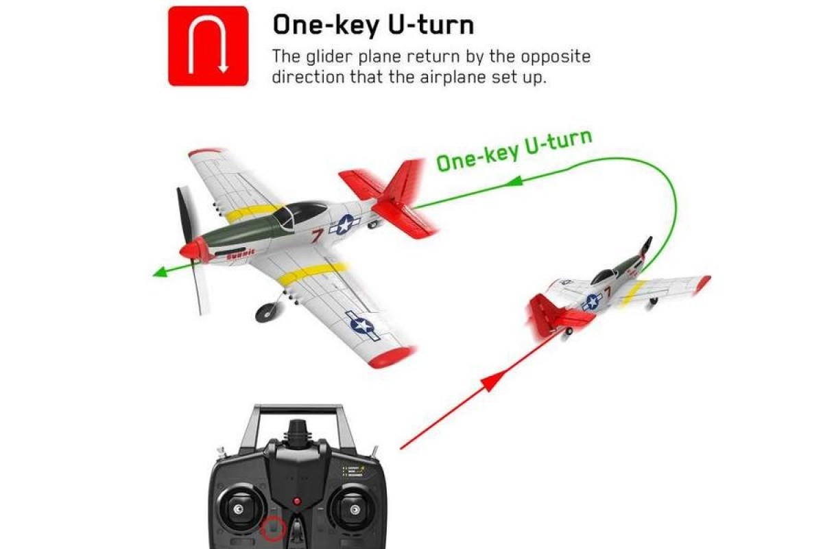 Функция разворота одним нажатием кнопки позволяет планеру вернуться в противоположном направлении от взлетающего самолета. Вы просто активируете функцию разворота до того, как самолет на радиоуправлении взлетит, и нажимаете кнопку «Разворот» во время полета, самолет автоматически улетит обратно с включенным гироскопом.